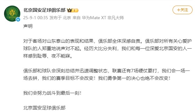 9月1日凌晨,@北京国安足球俱乐部 发布声明向球迷致歉,并承诺“勇争第一的决心绝不改变!”